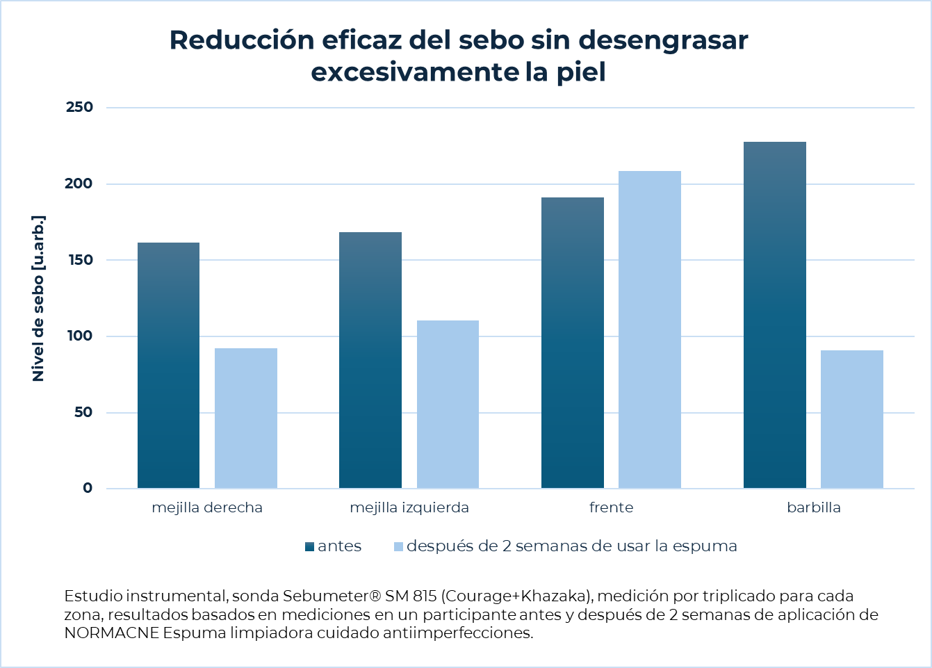 *Estudio de aplicación realizado con 30 voluntarios, evaluación mediante cuestionario tras una única aplicación de NORMACNE Espuma limpiadora cuidado antiimperfecciones.